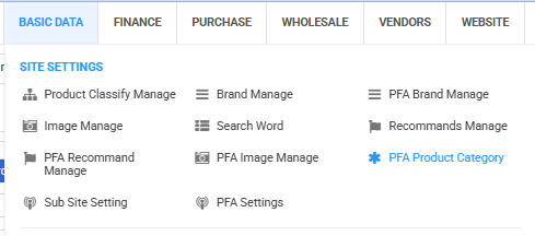 The PFA Product Category module under the Basic Data tab helps organize various product types into structured categories. It allows users to manage the hierarchy, visibility, and availability of each category across the platform.