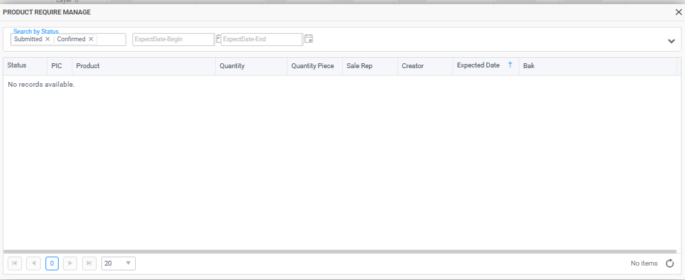 In the Product Requirement Management section, you can view product requests categorized by their status (Submitted, Confirmed), expected dates, and quantity information.