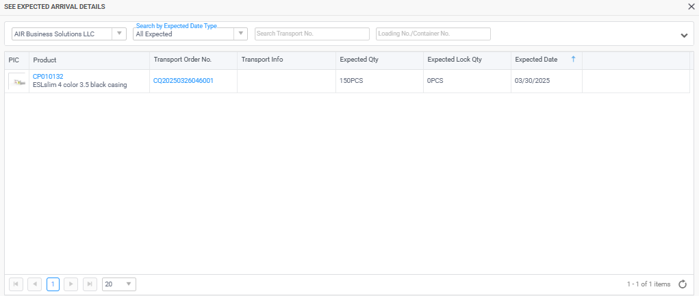 • Transport Info: Details about shipping, such as transport order number and expected quantity