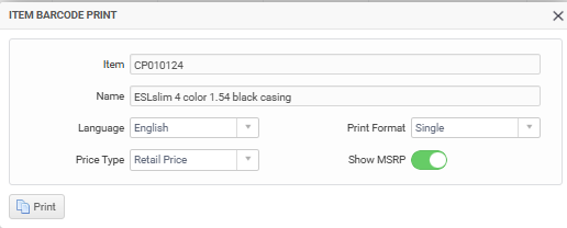 Quickly print barcode labels for products in various formats, including price types and descriptions.