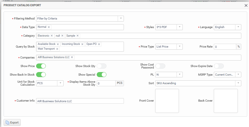 Export the product catalog with customized filters to analyze stock availability, prices, and other details: