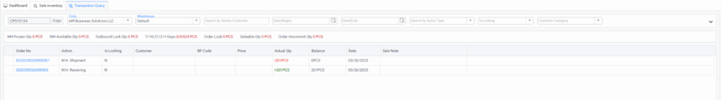 Query transaction records based on vendor, customer, date range, and action type. Track changes in inventory levels, including locks and uncommitted quantities.