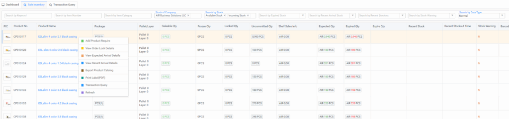 Sale Inventory is an essential tool under the Basic Data tab that helps businesses manage their inventory directly linked to sales. This feature provides a complete overview of product requirements, order locks, expected arrivals, recent arrivals, product catalog exports, label printing, and transaction queries. By leveraging Sale Inventory, you can streamline inventory management and optimize sales workflows.