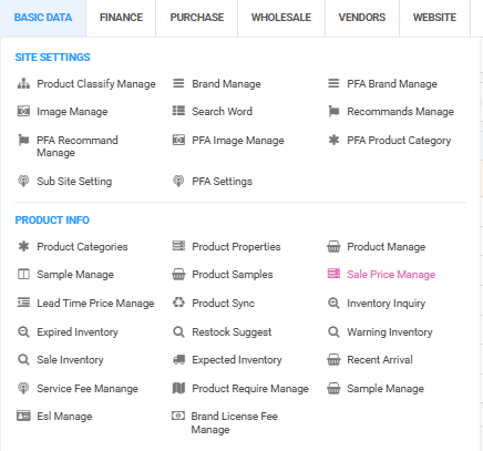 Sale Price Manage is a key feature under the Basic Data tab that allows users to set, edit, and import pricing details for various products. This module is designed to help you control retail, wholesale, import, and promotional pricing — ensuring your pricing strategy stays organized and up to date across platforms.