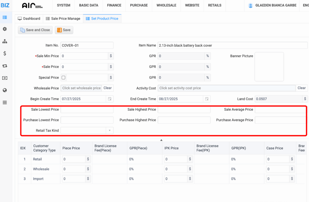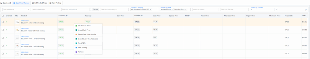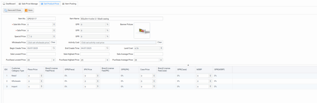 Sale Price Manage is more than just a price-setting tool — it’s an integrated pricing solution that covers retail, wholesale, and import data, including GPR, inventory status, cost breakdowns, and timeline management. Whether you are uploading price lists in bulk or setting prices per unit manually, this tab ensures your product pricing stays accurate and up to date.With additional tools like Item Posting and Import Pricing Templates, the Sale Price Manage module gives you full control over pricing workflows and ensures consistency across your product database.