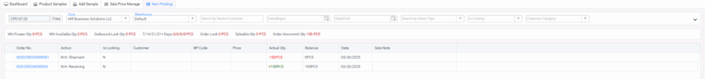 - Order No., Action Type, Customer, Price, Actual Qty, Balance, Notes – A breakdown of past item transactions.