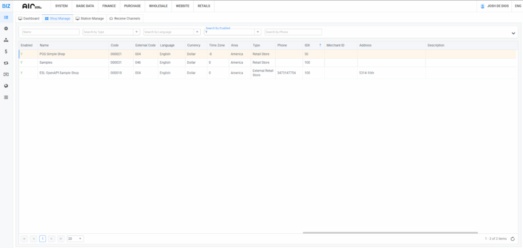- Enabled – Shows whether the shop is active (Y = Yes, active).