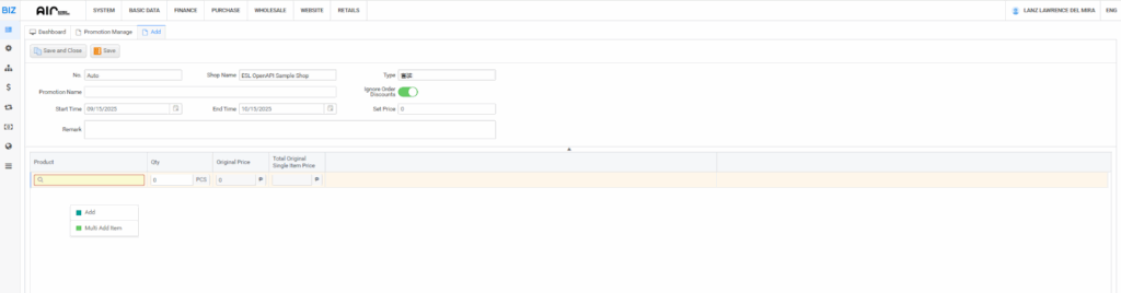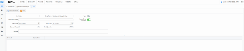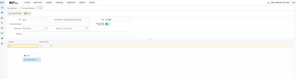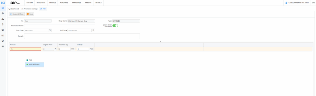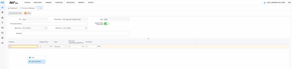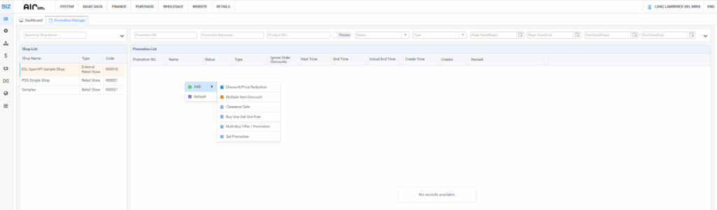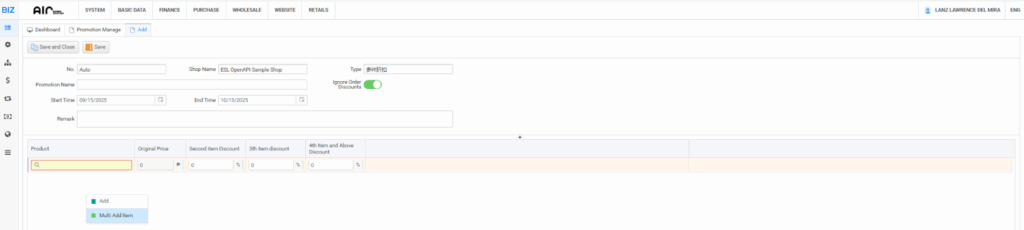 The Promotion Manage section is a crucial tool within the retail module for creating and overseeing various types of sales promotions and discounts. This feature allows you to set up different promotional campaigns, such as price reductions, multi-item discounts, and special offers, all from a centralized location.