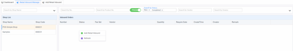 The “Retail Inbound Manage” module offers retailers a comprehensive way to track and manage inbound inventory orders. Whether you’re managing new shipments or tracking order status, this tool ensures that your inbound inventory is organized and accurately accounted for.
