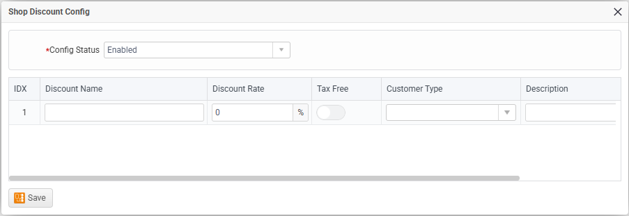 • Config Status – Lets you enable or disable the discount setup. (If set to “Enabled,” the discount is active.)