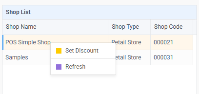 • On the left side, you’ll see a Shop List. This shows all your shops (e.g., POS Simple Shop, Samples) along with their type and code. You can select a shop here to configure its discounts.