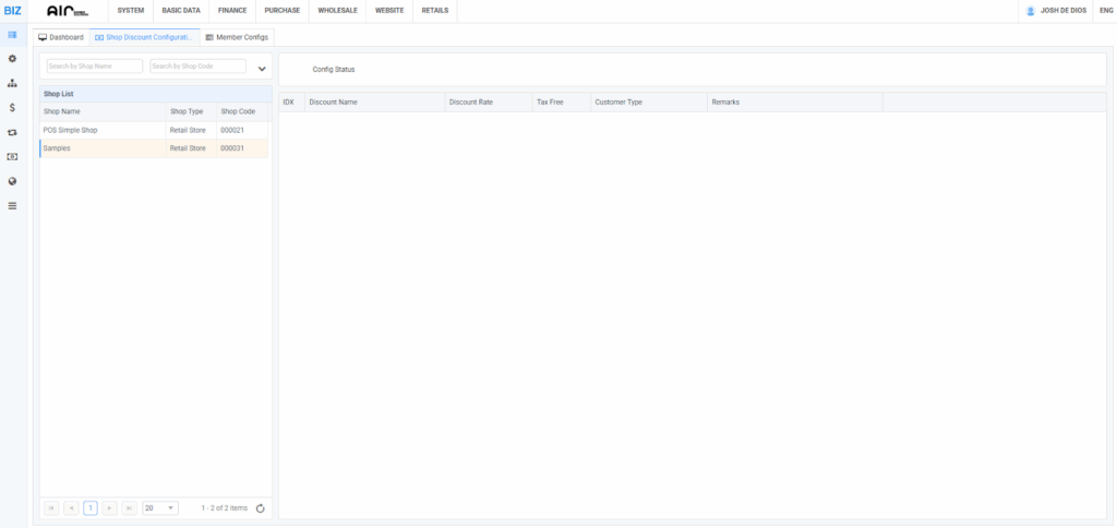 • On the right side, you’ll see the Config Status area. This is where the discount settings for the selected shop will appear.