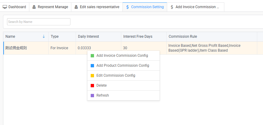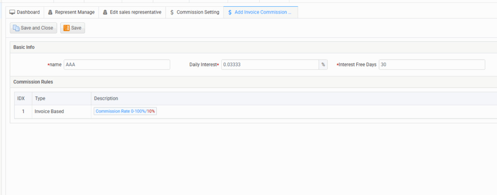 Commission rules can be formulated according to the actual situation of your company. First, create commission rules in Commission Settings, and then select the commission rules that apply to specific sales representatives in Represent Manage.