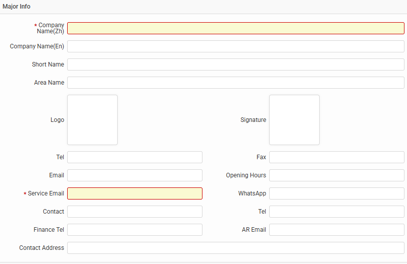 - Enter the required information, including company name (in both Chinese and English), short name, area name, and contact details.