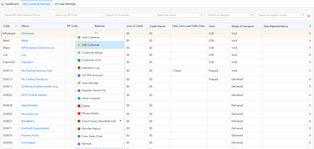 Managing wholesale customers efficiently is key to streamlining operations and maximizing productivity. The Customer Manage section, accessible under the Basic Data tab, provides a powerful and detailed interface to manage all aspects of customer relationships. From adding and editing customer profiles to managing permissions and tracking operations, this tool is designed to cover every customer-related need.
