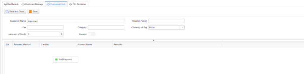 - Fields include: Customer Name, Retail Category, Currency, Credit Amount, Reseller Permit, Insured Status