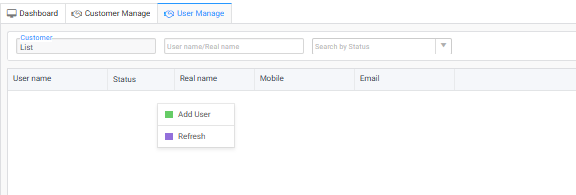 - Fields include: Username, Real Name, Status, Mobile, Email