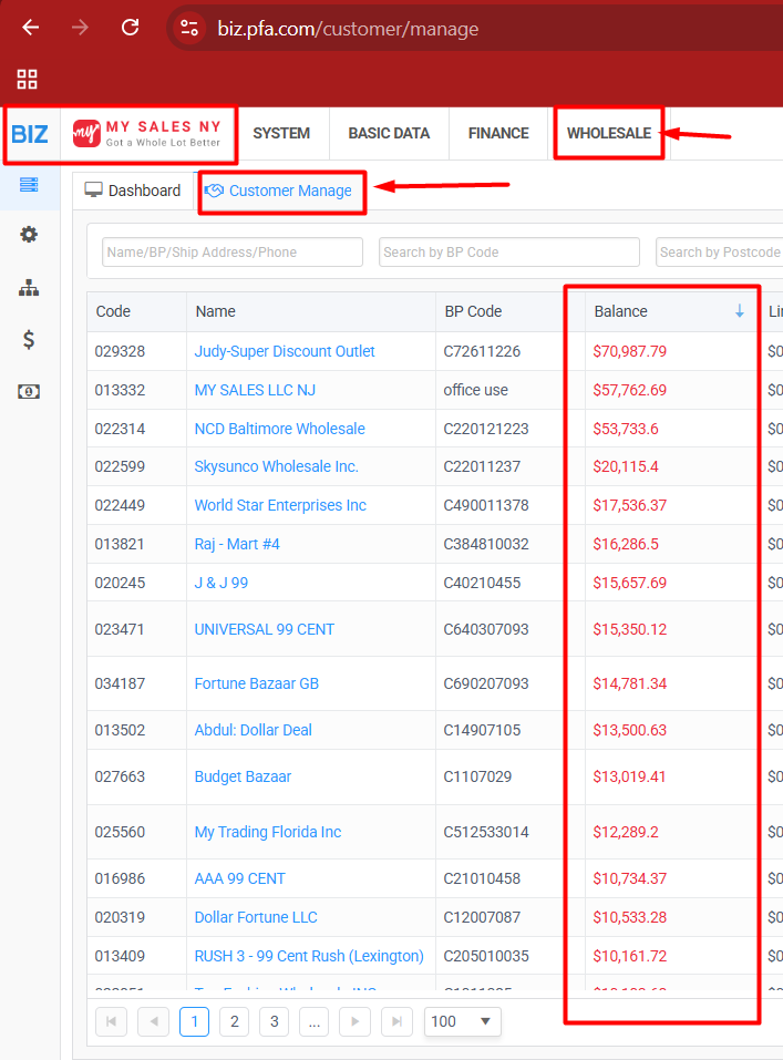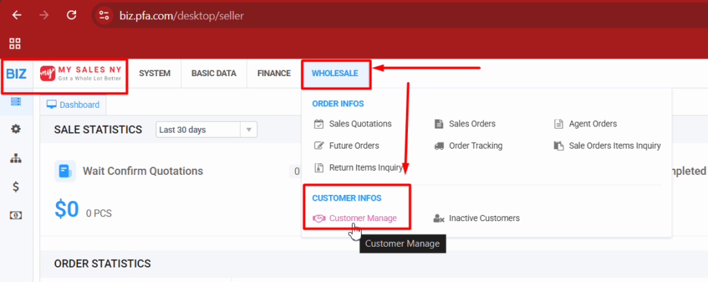 - From the top menu bar, click Wholesale, then select the Customer Manage section.