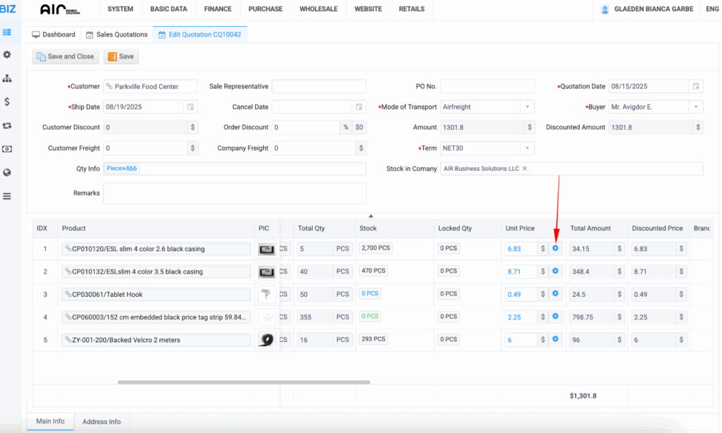 - Quotation Date, Mode of Transport, Buyer, Term, Stock in Company – auto-filled by default.