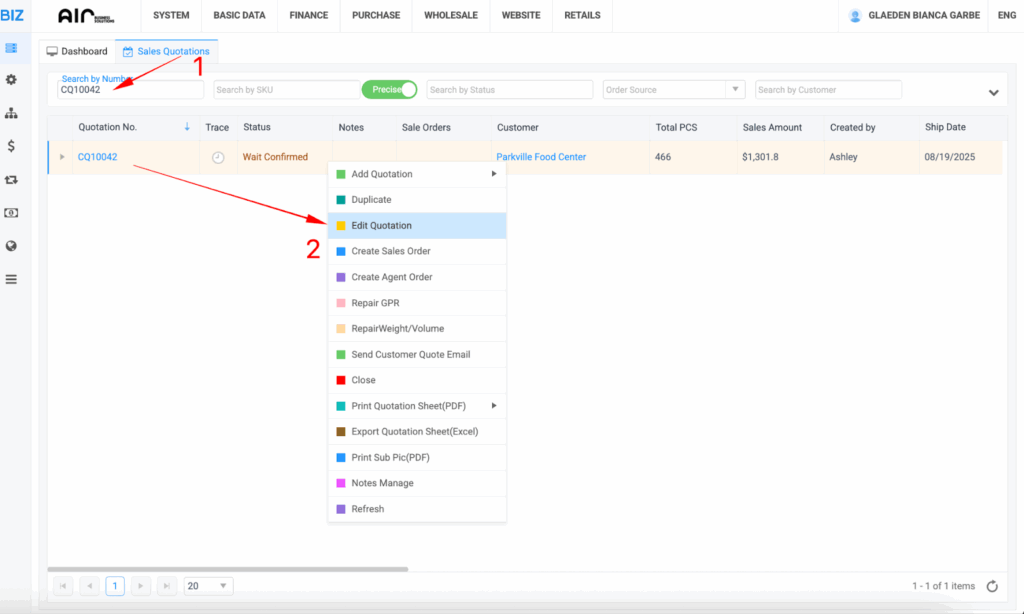 - Right-click on the order and select Edit Quotation.